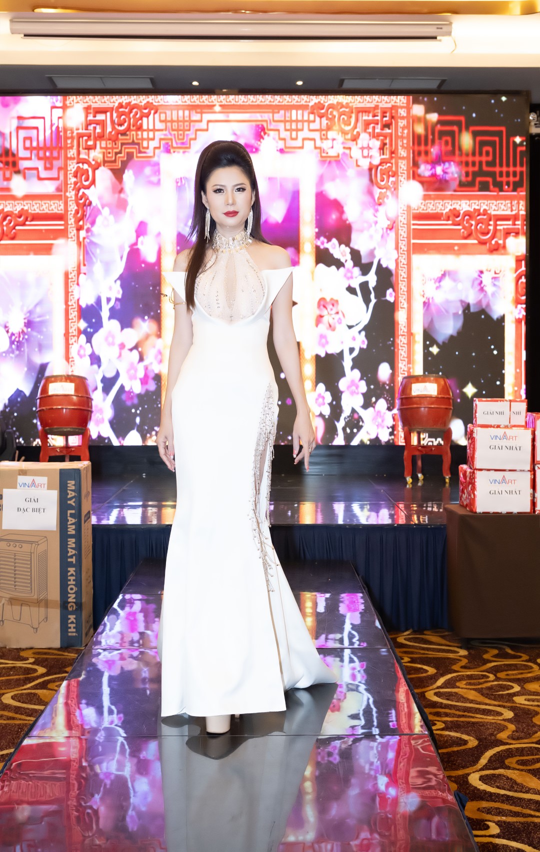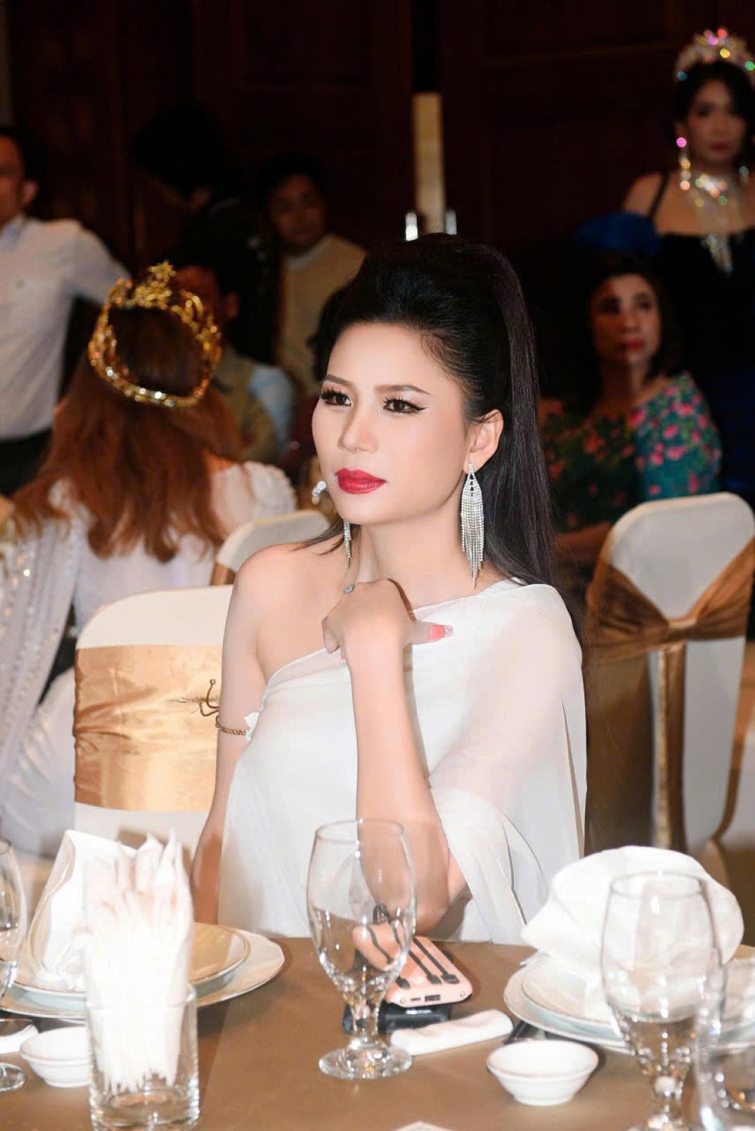 Vào phần chính của buổi lễ sự kiện, nàng hậu lựa chọn bộ dạ hội ánh bạc đính kết tinh xảo, ôm trọn vóc dáng thanh thoát. Thiết kế mang sắc bạc lạnh, kết hợp cùng những chi tiết pha lê rủ mềm như dòng ánh sáng, tạo nên hiệu ứng thị giác vừa lộng lẫy vừa tiết chế. Phần cổ áo cao được xử lý bằng chuỗi đá lấp lánh, nối dài xuống thân váy như biểu trưng cho sự tiếp nối của trí tuệ, bản lĩnh và kinh nghiệm, những giá trị làm nên vị thế của người “cầm cân nảy mực”.