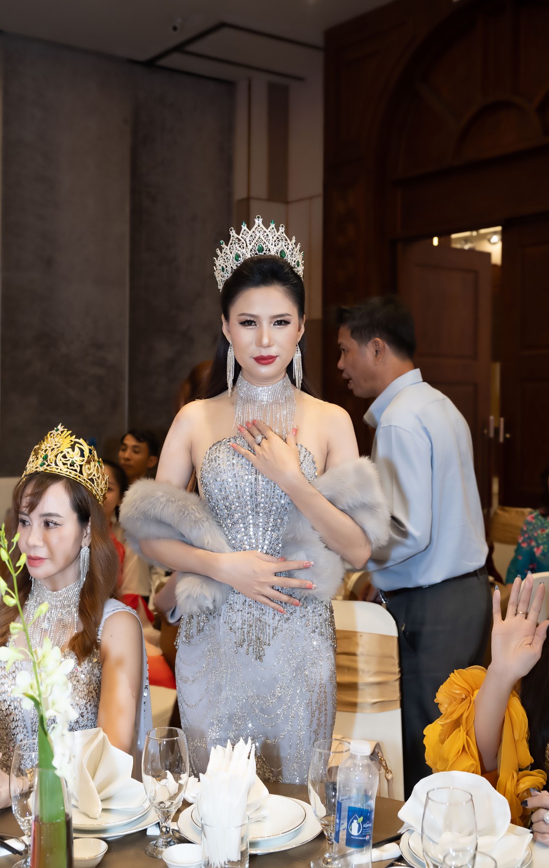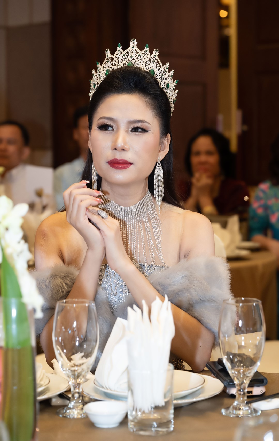 Điểm nhấn đặc biệt của tổng thể là vương miện và khăn choàng lông tông xám khói, giúp hình ảnh Á hậu Thanh Tươi toát lên khí chất quyền uy nhưng không phô trương, mềm mại mà vững vàng. Đây là lựa chọn trang phục mang tính tuyên ngôn: Một người phụ nữ đã bước qua ánh hào quang danh hiệu để chạm đến chiều sâu của vai trò và trách nhiệm.
