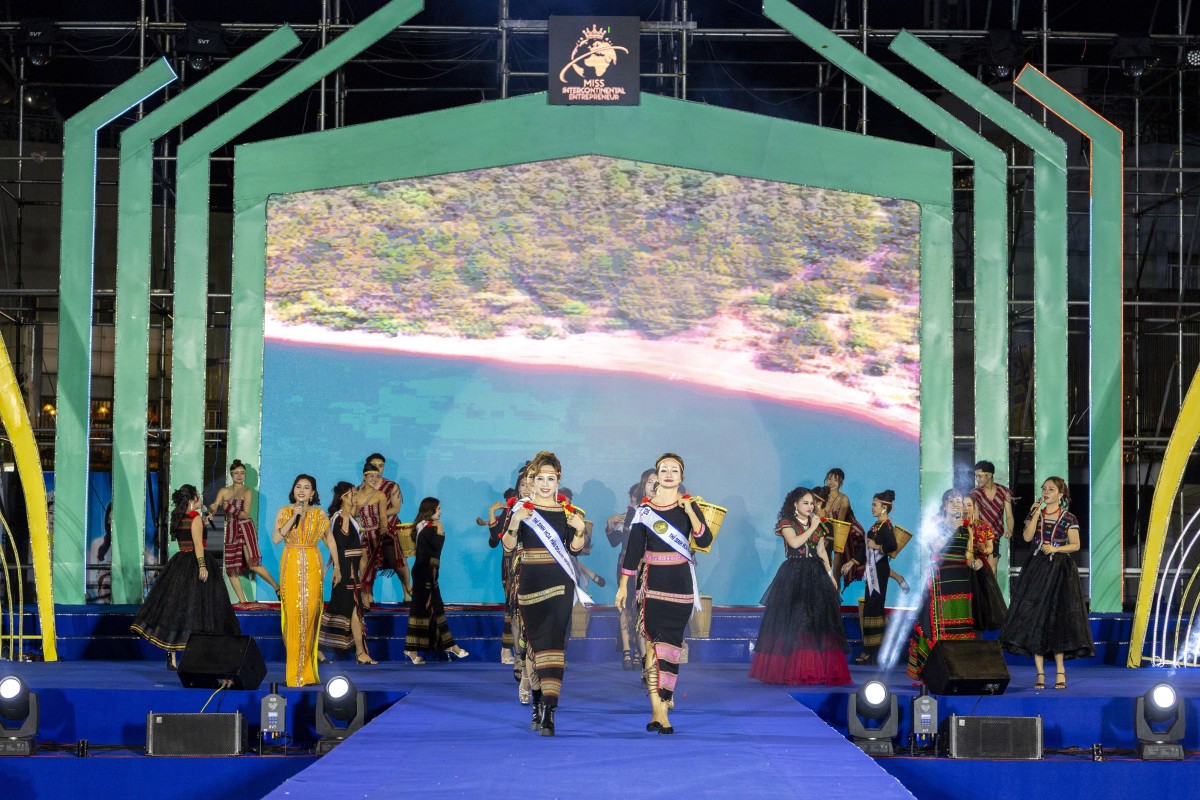 Phần trình diễn dạ hội, điểm nhấn của đêm chung kết đã đẩy cảm xúc của khán giả lên đỉnh điểm khi từng thí sinh xuất hiện lộng lẫy trong ánh đèn, tựa những đóa hoa rực rỡ giữa không gian lung linh của đêm Pleiku. Họ không chỉ khoe sắc đẹp mà còn thể hiện thần thái sang trọng, sự bản lĩnh và khát vọng vươn ra thế giới.
