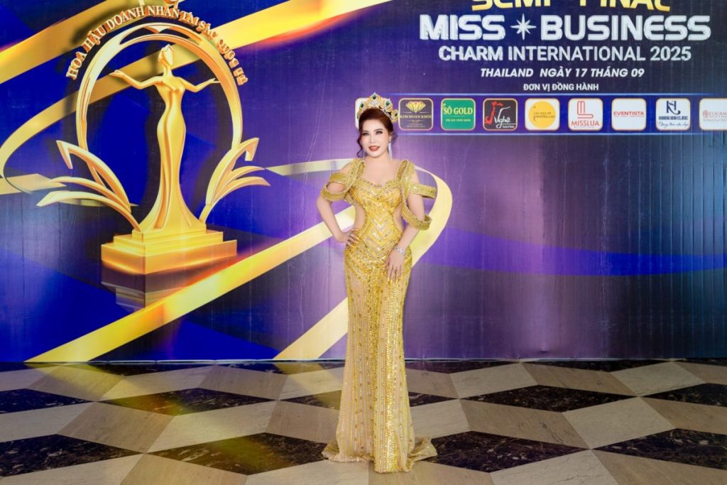 Sân khấu Colosseum Pattaya diễn ra vòng chung kết Miss Business Charm International 2025 là nơi hội tụ của tài năng và bản lĩnh. Ở đó, Hoa hậu Trịnh Mỹ Hòa tỏa sáng rực rỡ trong trang phục dạ hội vàng kim, màu sắc của thịnh vượng, quyền lực và ánh dương. Bộ lông vũ vàng rực rỡ không chỉ là chi tiết thời trang mà là hình ảnh Phượng Hoàng sẵn sàng bay cao, tượng trưng cho sự hồi sinh và vinh quang bất diệt của người phụ nữ doanh nhân.